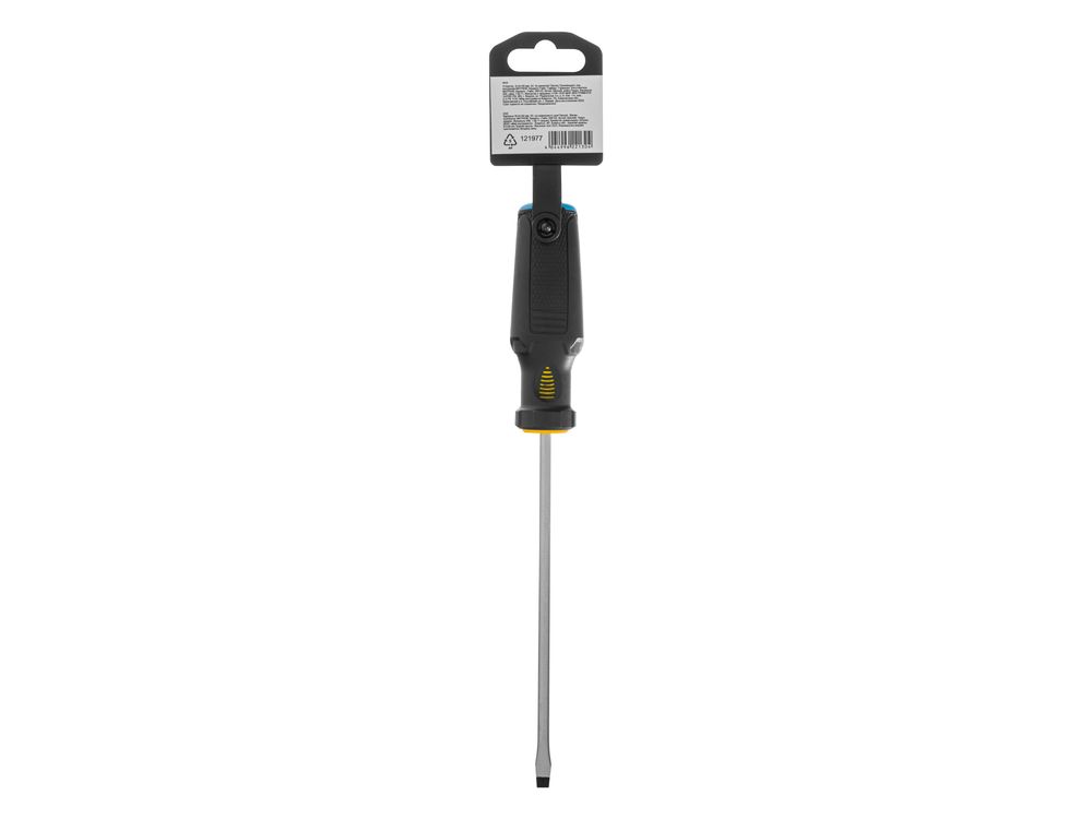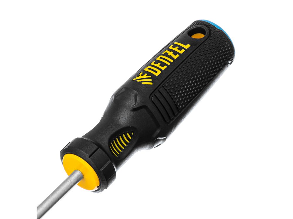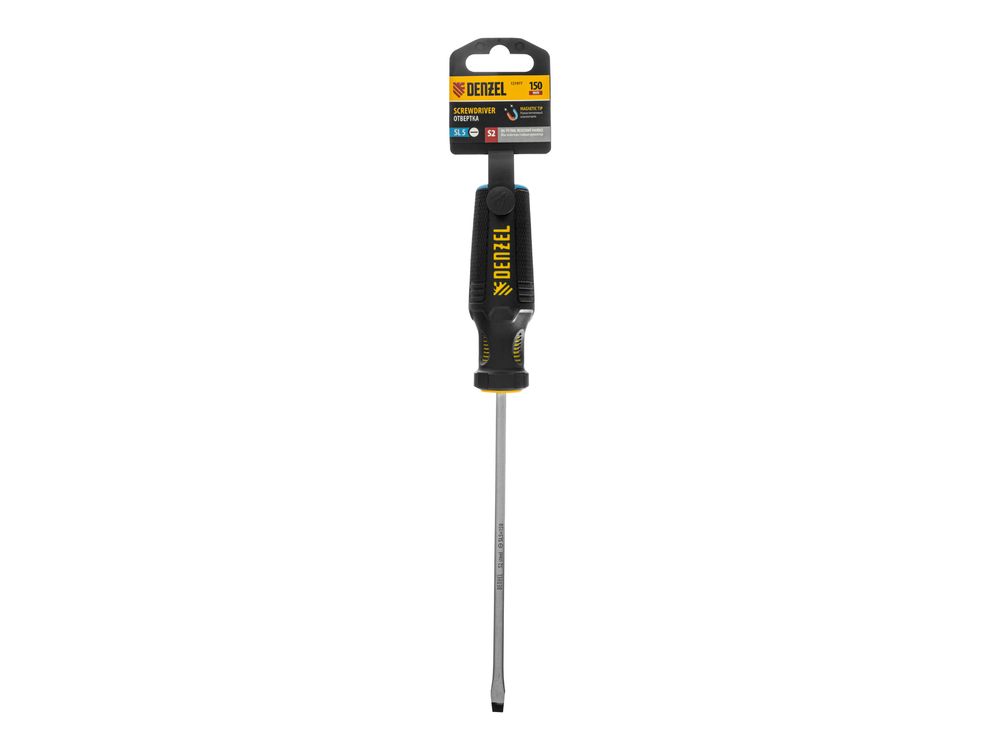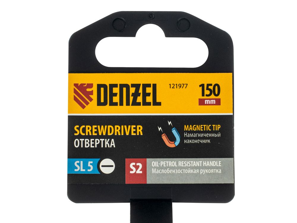 Отвертка Denzel 121977 с трехкомпонентной рукояткой, со стержнем из стали S2, длиной 150 мм, предназначена для монтажа и демонтажа винтов и саморезов с прямым шлицем SL5. Высокоточный намагниченный шлиц крепко фиксируется в головке крепежа. Отвертка выдерживает интенсивное применение, предназначена для выполнения профессиональных ремонтных и монтажных работ.