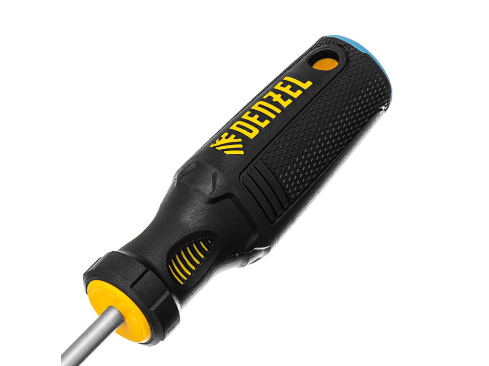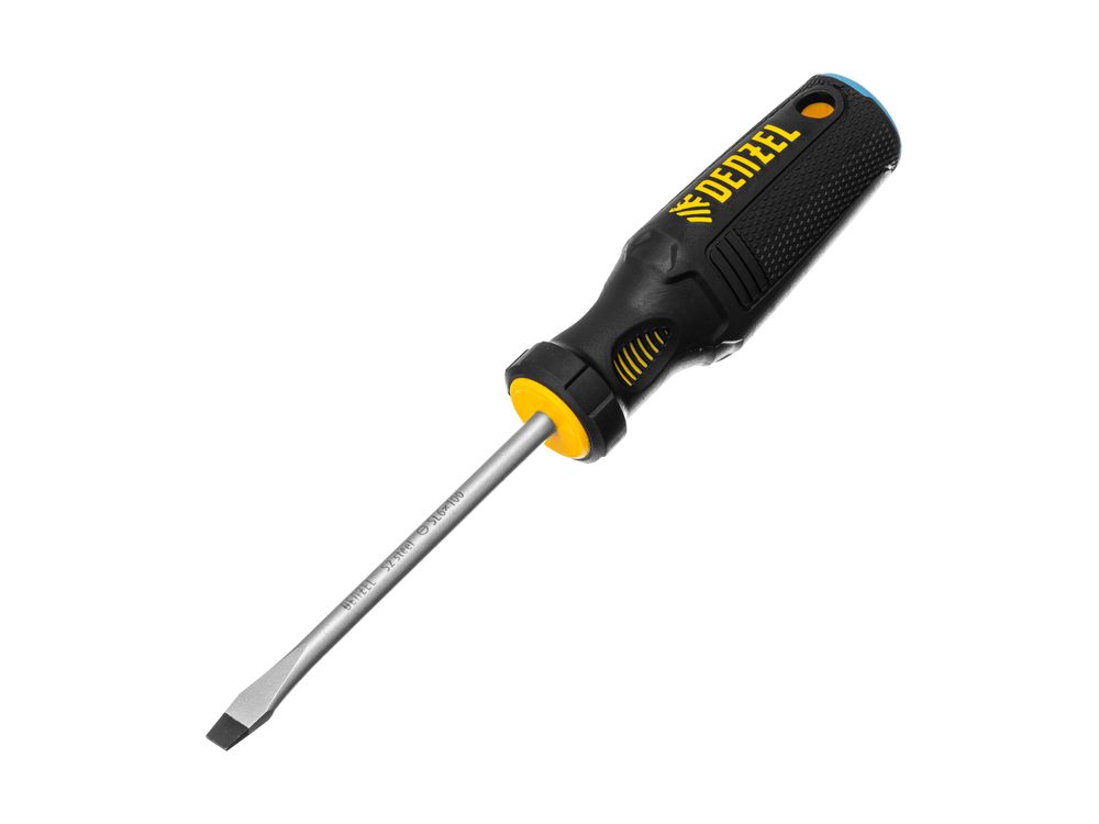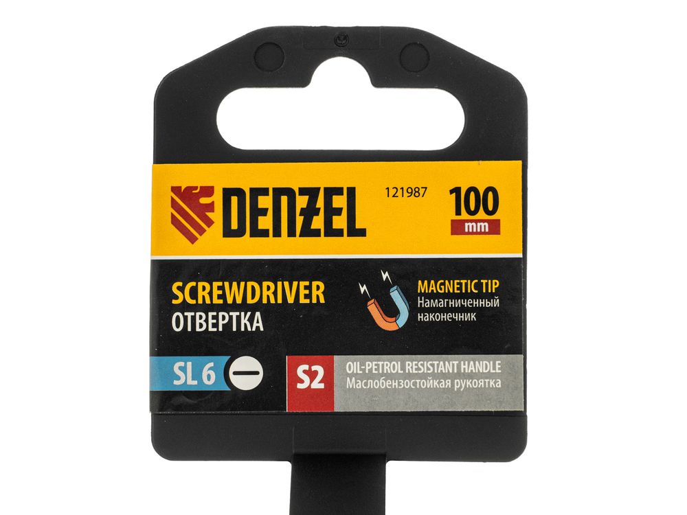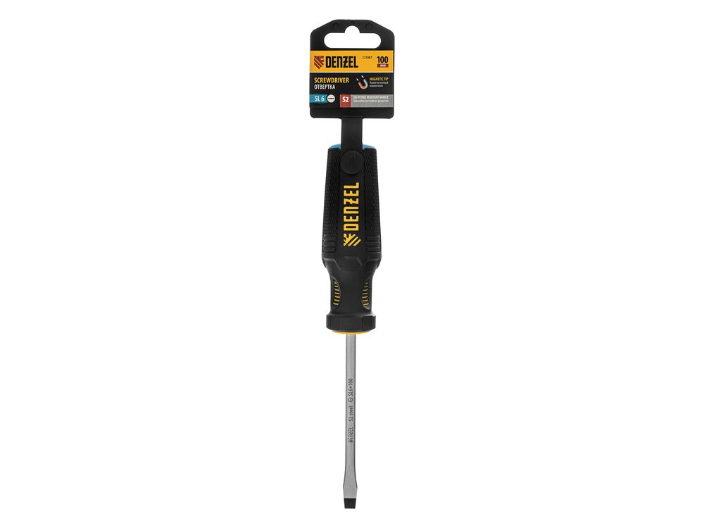 Отвертка Denzel 121987 с трехкомпонентной рукояткой, со стержнем из стали S2, длиной 100 мм, предназначена для монтажа и демонтажа винтов и саморезов с прямым шлицем SL6. Высокоточный намагниченный шлиц крепко фиксируется в головке крепежа. Отвертка выдерживает интенсивное применение, предназначена для выполнения профессиональных ремонтных и монтажных работ.