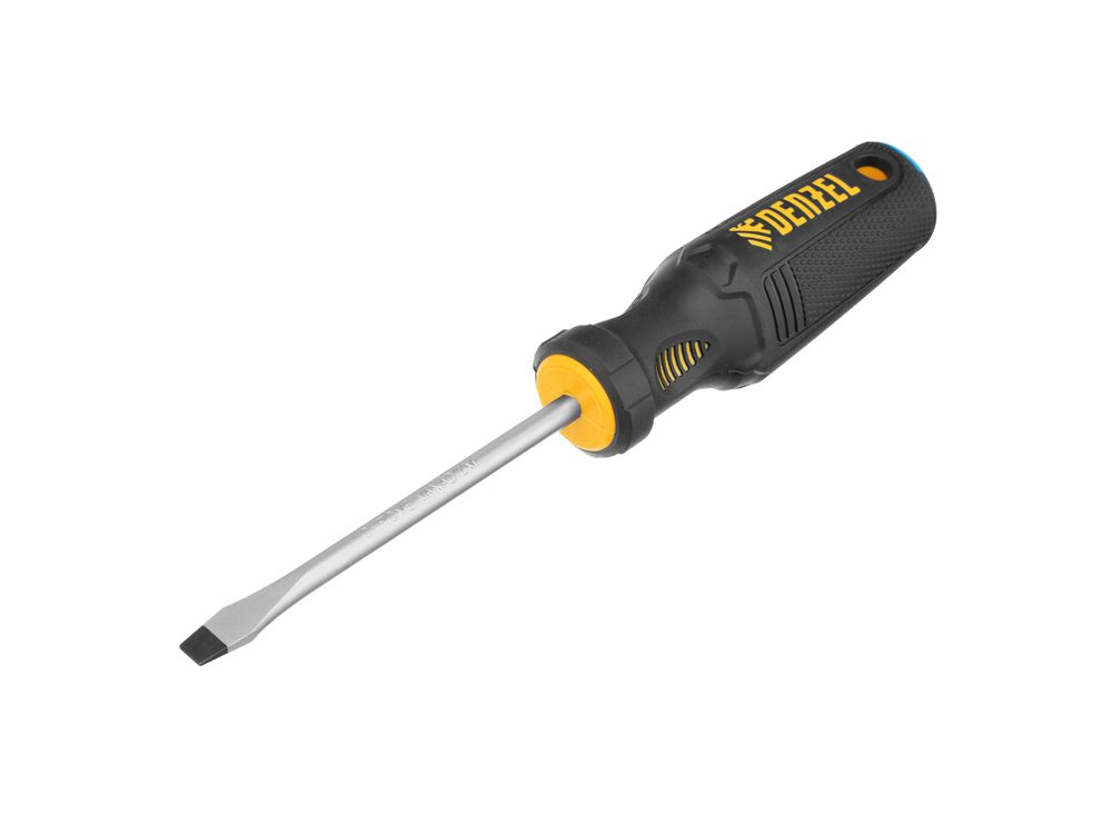 Отвертка SL6 х 100 мм Denzel 12198 из стали CrV, с трехкомпонентной рукояткой, используется для монтажа и демонтажа винтов и саморезов с прямым шлицем Slotted. Намагниченный шлиц крепко фиксируется в головке крепежа. Отвертка выдерживает интенсивное применение и предназначена для выполнения профессиональных ремонтных и монтажных работ.
