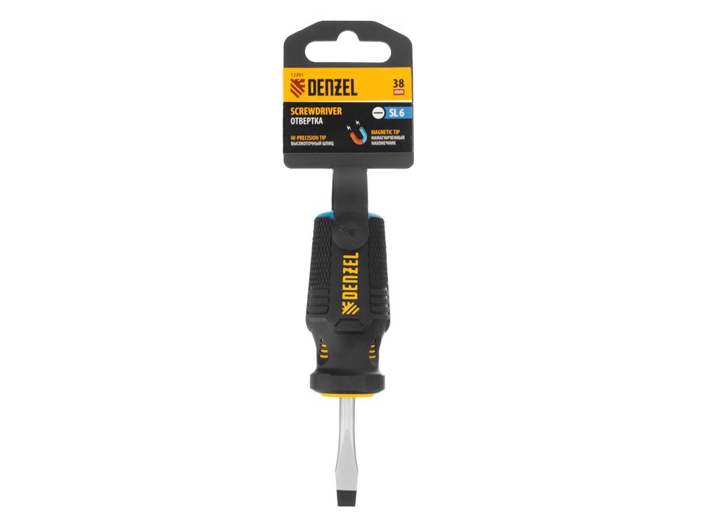Отвертка SL6 х 38 мм Denzel 12201 из стали CrV, с трехкомпонентной рукояткой, используется для монтажа и демонтажа винтов и саморезов с прямым шлицем Slotted. Намагниченный шлиц крепко фиксируется в головке крепежа. Отвертка выдерживает интенсивное применение и предназначена для выполнения профессиональных ремонтных и монтажных работ.