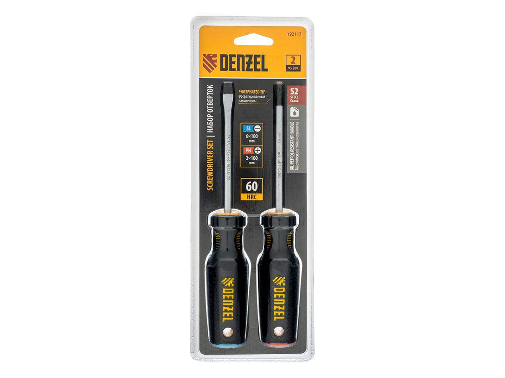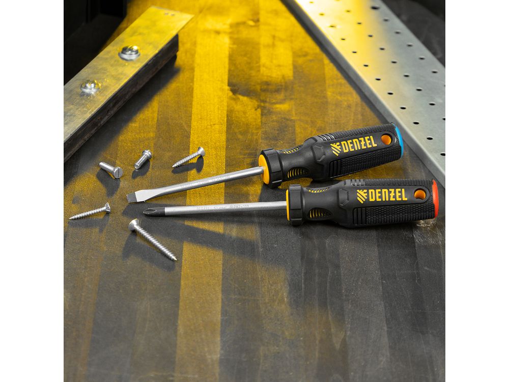 Комбинированный набор Denzel 122117 состоит из 2 отверток типоразмеров PH2 и SL6 длиной 100 мм, изготовленных из стали S2, с трехкомпонентными рукоятками. Намагниченные высокоточные шлицы позволяют направлять отвертку с крепежом одной рукой, а другой придерживать закрепляемую деталь. Набор предназначен для выполнения профессиональных монтажных и демонтажных работ с резьбовыми соединениями.