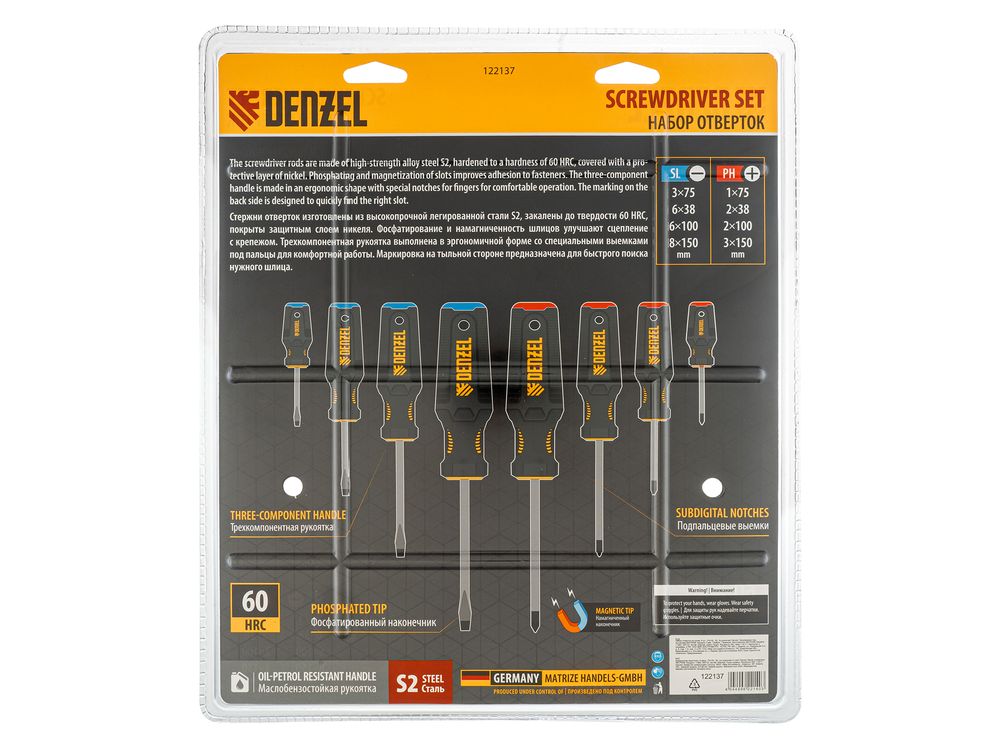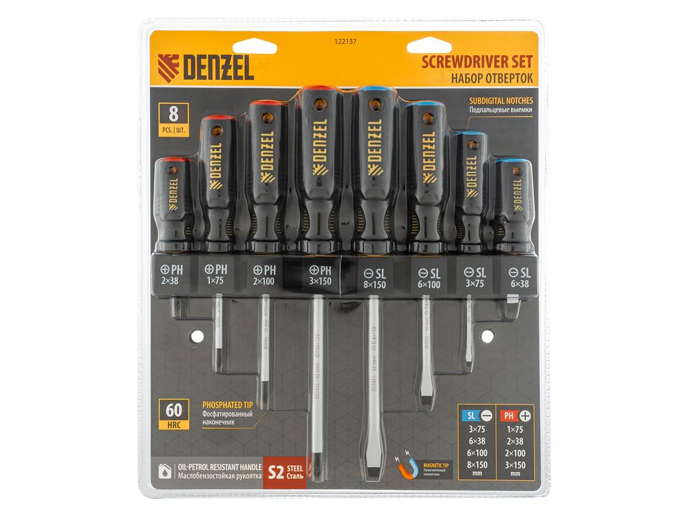 Набор Denzel 122137 состоит из 8 отверток с трехкомпонентными рукоятками, изготовленных из стали S2 и предназначенных для работы с резьбовым крепежом типа PH и SL. Благодаря намагниченным высокоточным шлицам направлять отвертки с крепежом можно одной рукой. Отвертка с длиной стержня 38 мм удобна для работы в ограниченном пространстве. Набор подходит для профессионального использования.