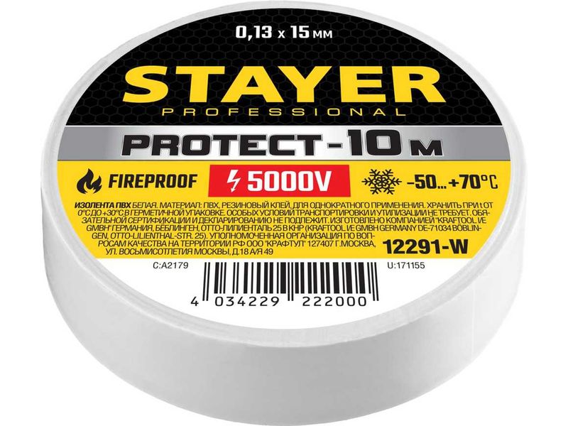 STAYER Protect-10 Изолента ПВХ, не поддерживает горение, 10м (0,13х15 мм), белая