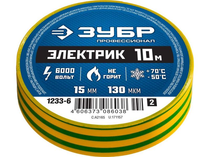 ЗУБР Электрик-10 желто-зеленая изолента ПВХ, 10м х 15мм