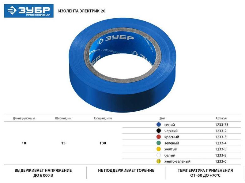 Купить ЗУБР Электрик-10 Изолента ПВХ, не поддерживает горение, 10м (0,13х15мм), белая