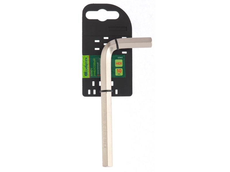 Ключ имбусовый никелированный Сибртех 12343 размером 10 мм, из закаленной стали 45Х, используется для монтажа и демонтажа резьбового крепежа с шестигранным шлицем HEX. Пригодится для сборки мебели, ремонта бытовой техники, велосипедов и автомобилей.