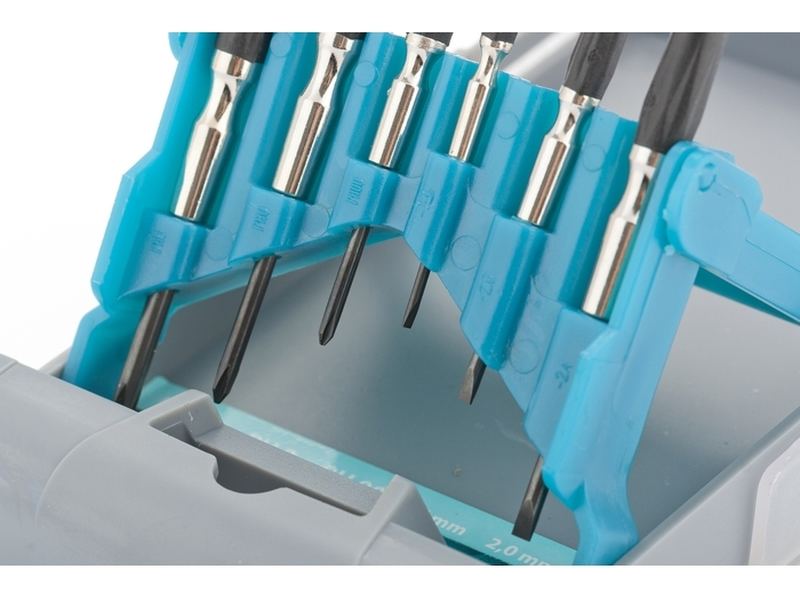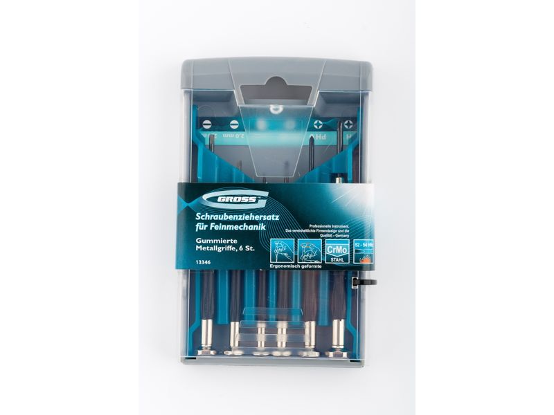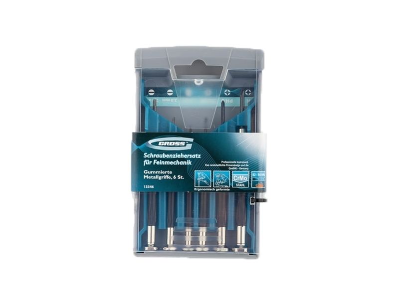 Набор отверток для точной механики Gross 13346, CrMo, с металлическими обрезиненными рукоятками, 6 предметов в боксе-трансформере, пригодится при монтаже/демонтаже микровинтов SL и PH. Высококачественное исполнение деталей набора позволяет использовать его для решения профессиональных задач в ходе ремонта электроники, очков и других мелких механизмов.