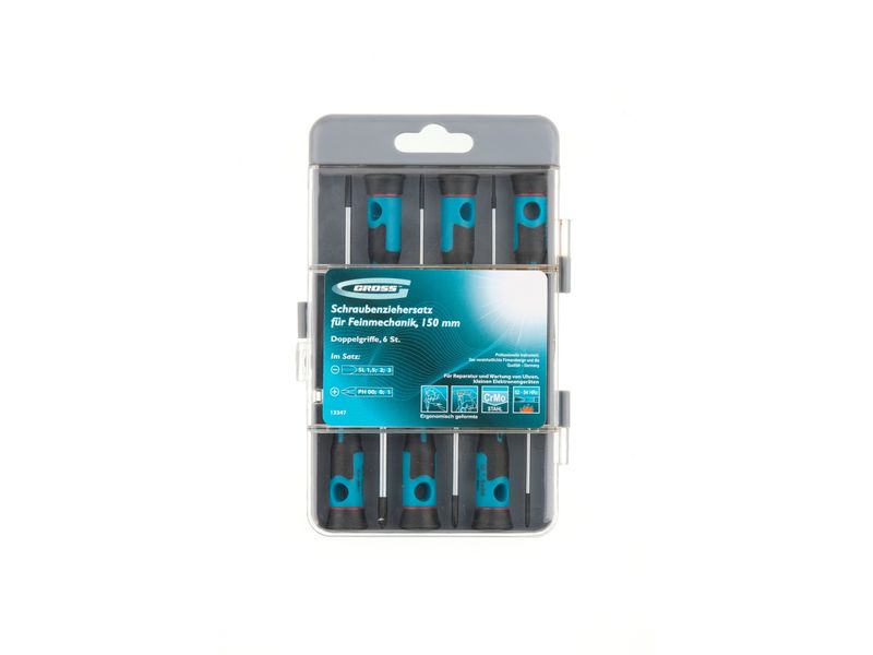 Набор отверток для точной механики Gross 13347, CrMo, с двухкомпонентными рукоятками, в пластиковом боксе, позволяет проводить работы с мелкими винтами при ремонте бытовой техники, часовых механизмов и т.д. Отвертки рассчитаны на монтаж/демонтаж крепежа типоразмера SL и PH. Профессиональный набор пригодится при решении сложных задач с интенсивными нагрузками.