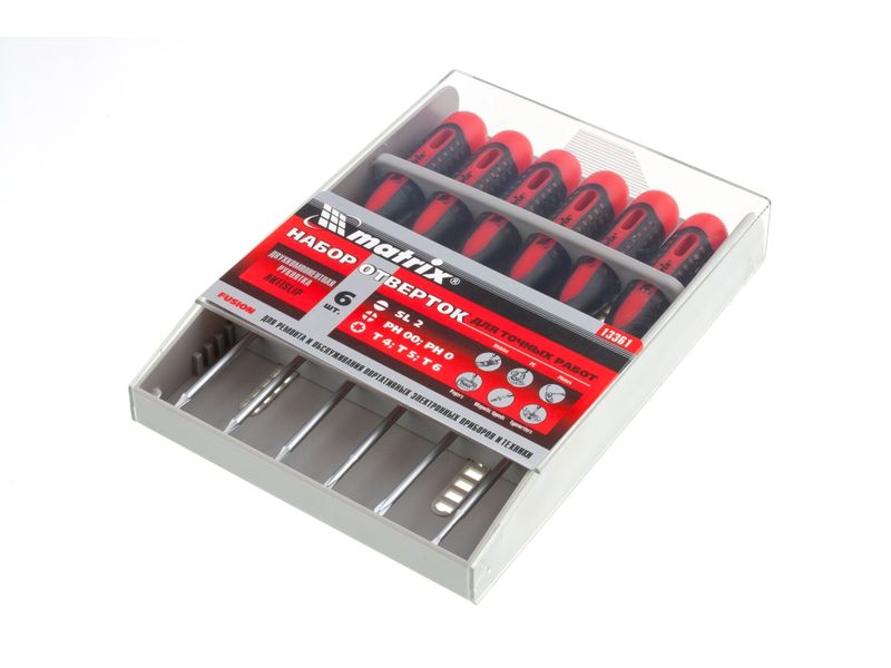 Набор отверток для точных работ Matrix Fusion 13361 c двухкомпонентными рукоятками состоит из 6 инструментов, упакованных в пластиковый пенал, и предназначен для проведения обслуживания и ремонта портативной техники. Отвертки подходят для крепежных элементов со шлицами PH, SL и Torx. Набор пригодится как профессионалам, так и домашним умельцам.