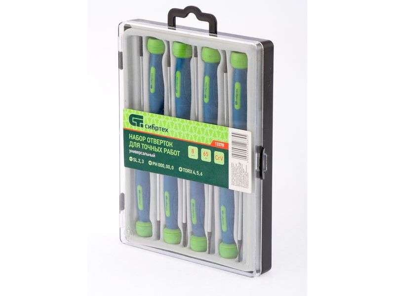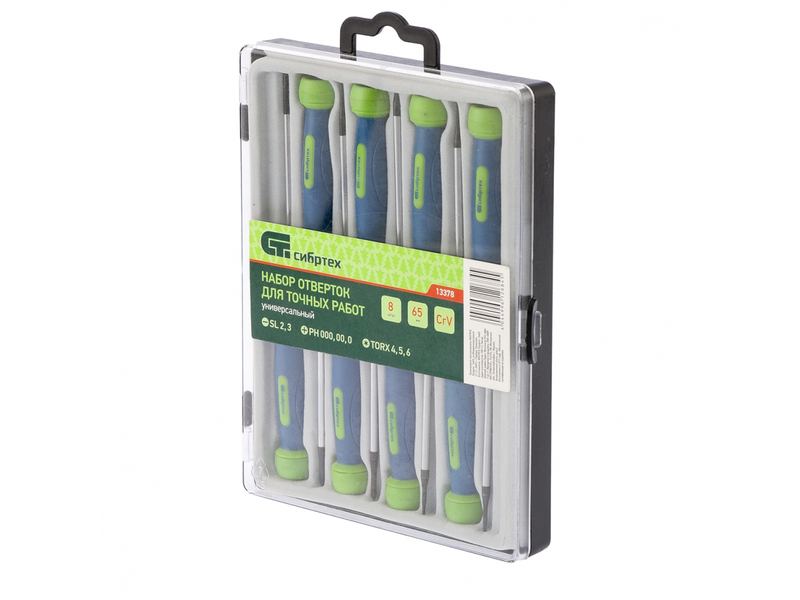 Универсальный набор отверток Сибртех 13378 включает 8 инструментов из стали CrV и рассчитан на полупрофессиональное использование при проведении точных работ. Отвертками можно закручивать и откручивать микровинты типа SL, PH и TORX, поэтому они пригодятся для ремонта мелкой бытовой техники, электроники, детских игрушек и других устройств.