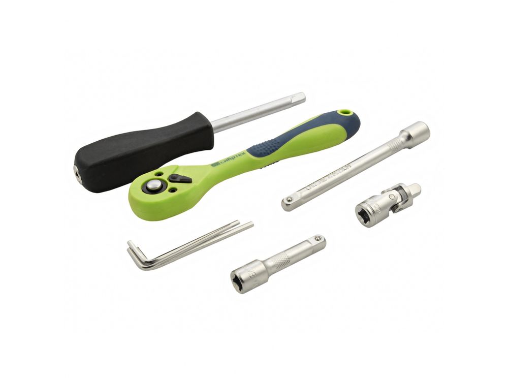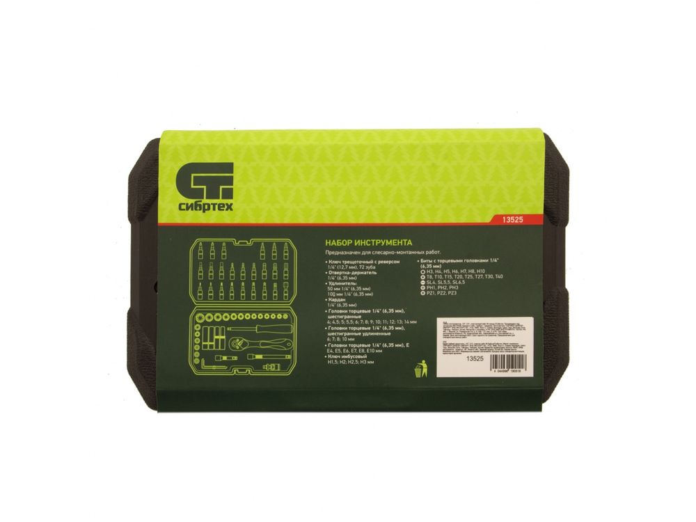 Набор инструментов Сибртех 13525, 1/4 дюйма, в пластиковом кейсе, состоит из 56 предметов, изготовленных из стали CrV-группы и предназначенных для закручивания и откручивания резьбовых крепежей. Имеющиеся в комплекте 2 удлинителя и кардан облегчают работу в труднодоступных местах. Набор будет полезен для ремонта автомобиля в гараже, пригодится также и в быту.