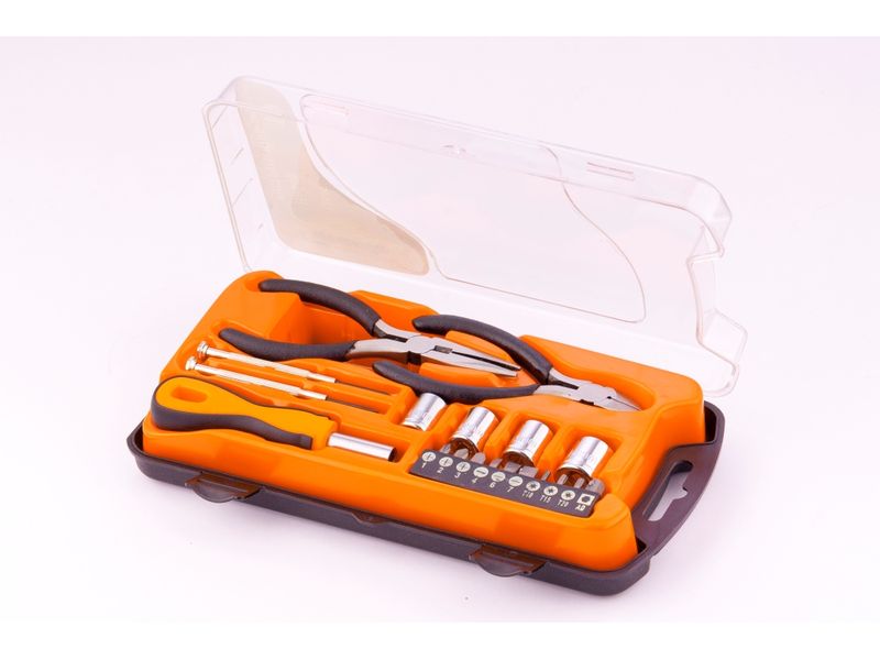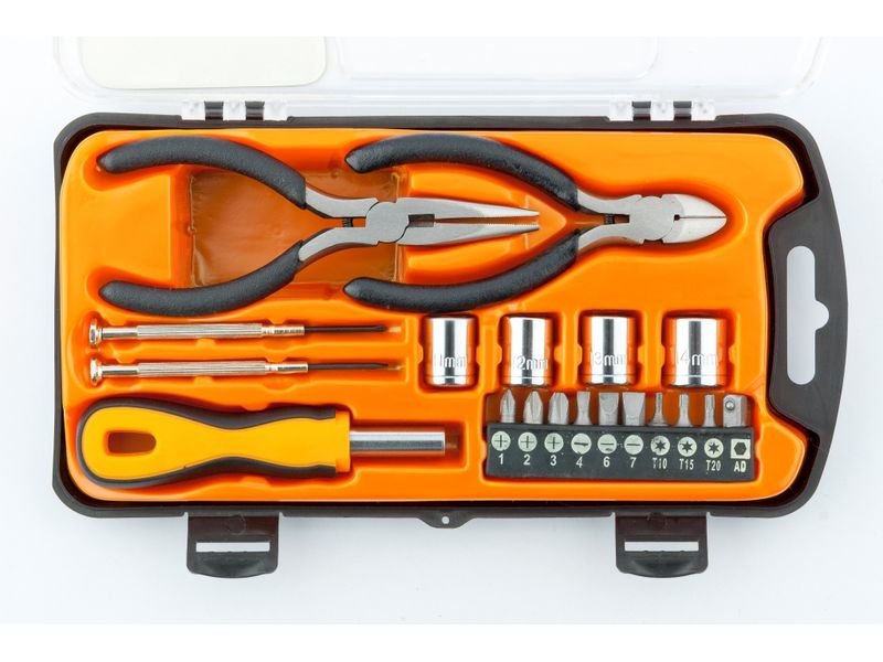 Набор Sparta 13546 из 19 предметов используется для проведения слесарно-монтажных работ. В комплект входят отвертки для точных работ, отвертка для бит, биты и торцевые головки для монтажа/демонтажа крепежных элементов, бокорезы и длинногубцы для захвата, удержания и перекусывания проводов и мелких деталей. Набор будет полезен дома и в частной мастерской.
