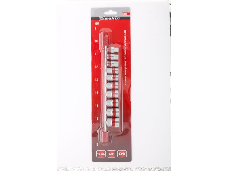 Набор торцевых головок Matrix 13558 из стали CrV, с посадочным гнездом 3/8 и шестигранным профилем, включает 10 насадок диаметром 8-19 мм, предназначенных для работы с резьбовыми соединениями. Пригодится для проведения бытового ремонта, будет полезен сантехнику, слесарю, авторемонтнику.