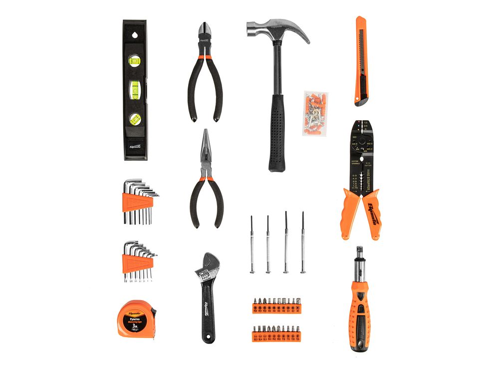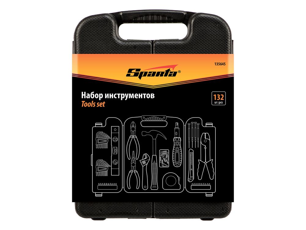 Набор инструментов Sparta 135645 включает в себя 132 предмета для бытового применения: обжимные клещи, отвертки, в том числе для точных работ, молоток-гвоздодер, бокорезы, строительный уровень, разводной и имбусовые ключи, биты-вставки с адаптером, длинногубцы, рулетку, канцелярский нож, а также набор крепежа. Инструменты оптимально подходят для выполнения слесарно-монтажных работ дома или на даче.