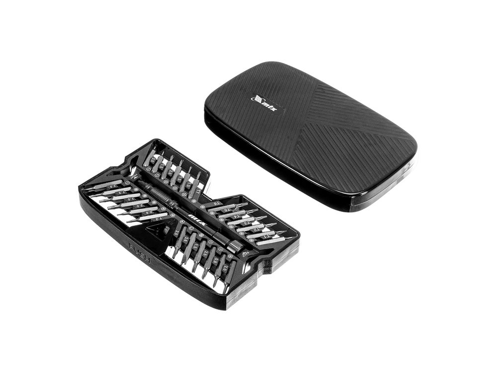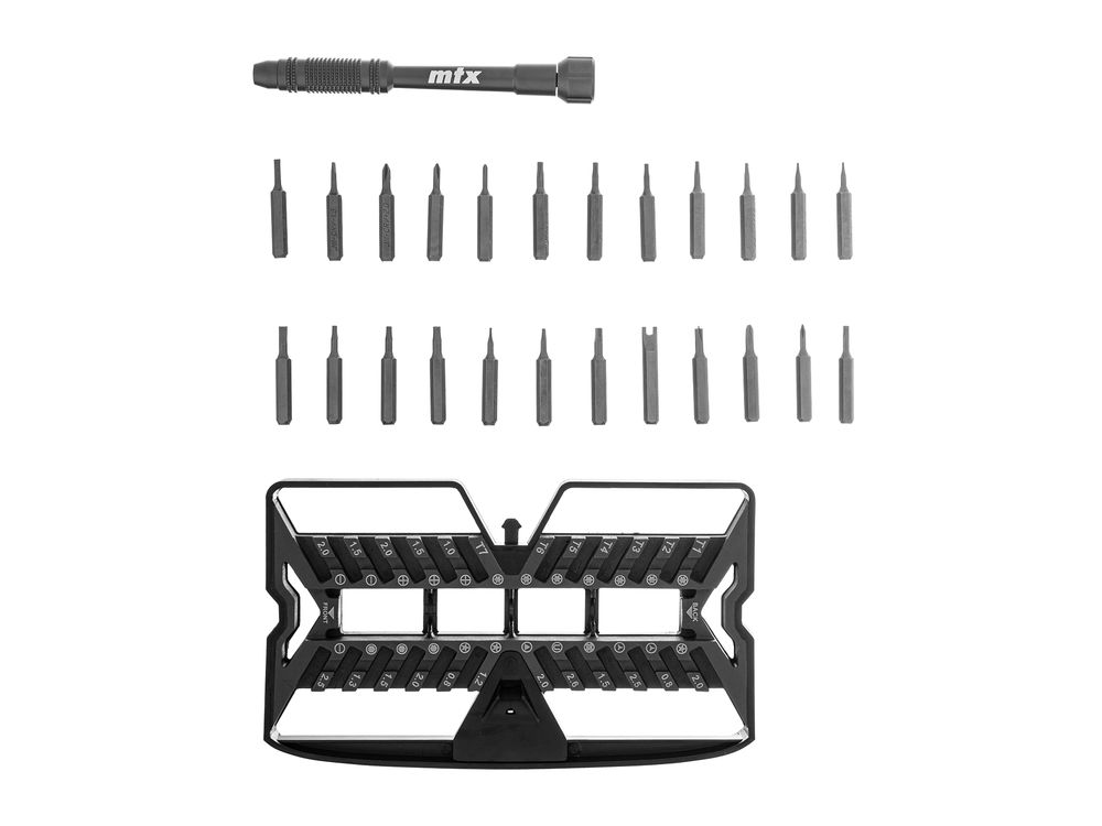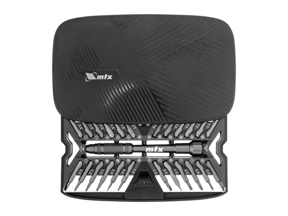 Набор для точных работ 26 в 1 MTX 135677 содержит 24 биты с наконечниками PH, SL,T, H, Str, Y, St, TR, U, отвертку и пластиковый кейс. С его помощью можно отремонтировать очки, игрушки, портативную и бытовую технику и т.д.