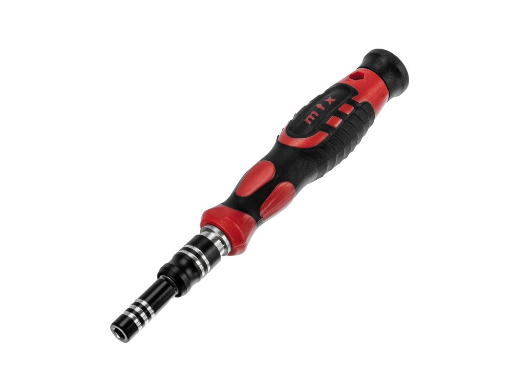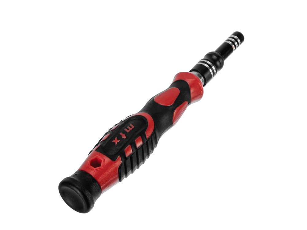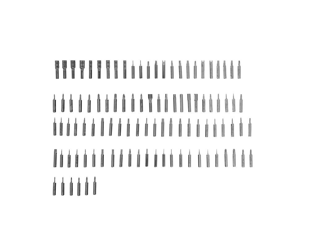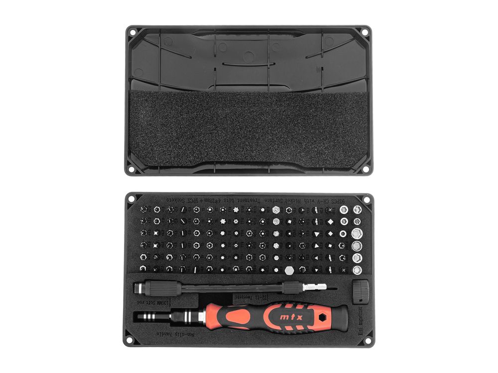 Набор для точных работ MTX 135697 включает в себя 93 биты, 9 торцевых головок, телескопический и гибкий удлинители, намагничиватель-размагничиватель бит, отвертку и пинцет с защитным колпачком. С его помощью можно отремонтировать очки, игрушки, портативную и бытовую технику и т.д. Выдвижной стержень, гибкий удлинитель и пинцет позволяют работать с мелкими деталями в углублениях и труднодоступных местах.