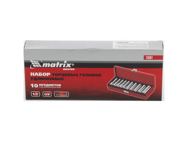Набор из 10 удлиненных торцевых головок Matrix 13581 диаметром 10-22 мм, с посадочным квадратом 1/2, используется для монтажа и демонтажа резьбовых соединений. Насадки особенно актуальны для работы в труднодоступных местах. набор применяется в автомастерских, подходит также для самостоятельного использования в гараже.