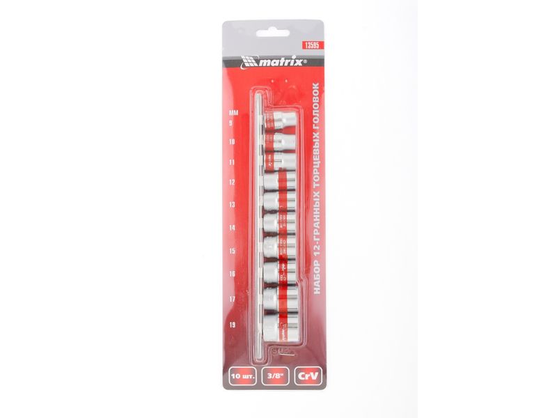 Набор из 10 торцевых головок размером 9-19 мм Matrix 13595 с присоединительным квадратом 3/8, с 12-гранным профилем, из стали CrV, предназначен для работы с небольшими резьбовыми соединениями. Насадки будут полезны автовладельцу, работнику автосервиса и домашнему мастеру.