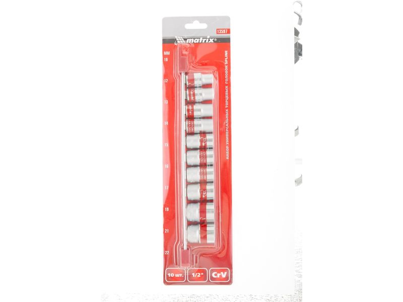Набор универсальных торцевых головок Matrix 13597 состоит из 10 насадок размером 10-22 мм, из стали CrV, с посадочным гнездом 1/2 и 12-гранным профилем Spline. Комплект включает головки популярных размеров и используется для слесарно-монтажных работ в бытовой и профессиональной сферах.