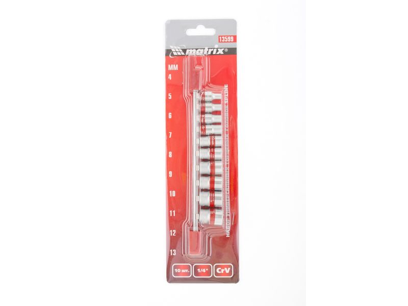 Набор универсальных торцевых головок Matrix 13599 состоит из 10 насадок размером 4-13 мм, из стали CrV, с посадочным гнездом 1/4 и 12-гранным профилем Spline. Комплект включает головки популярных размеров и используется для слесарно-монтажных работ в бытовой и профессиональной сферах.