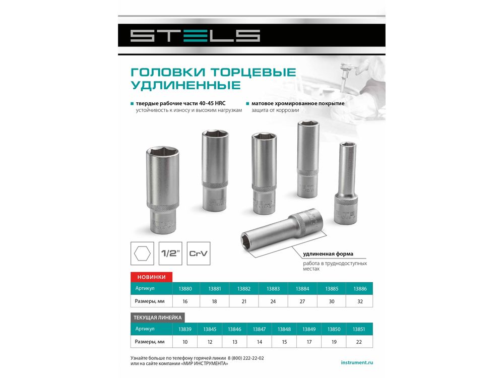 Головка торцевая удлиненная, 16 мм, шестигранная, CrV, под квадрат 1/2-22