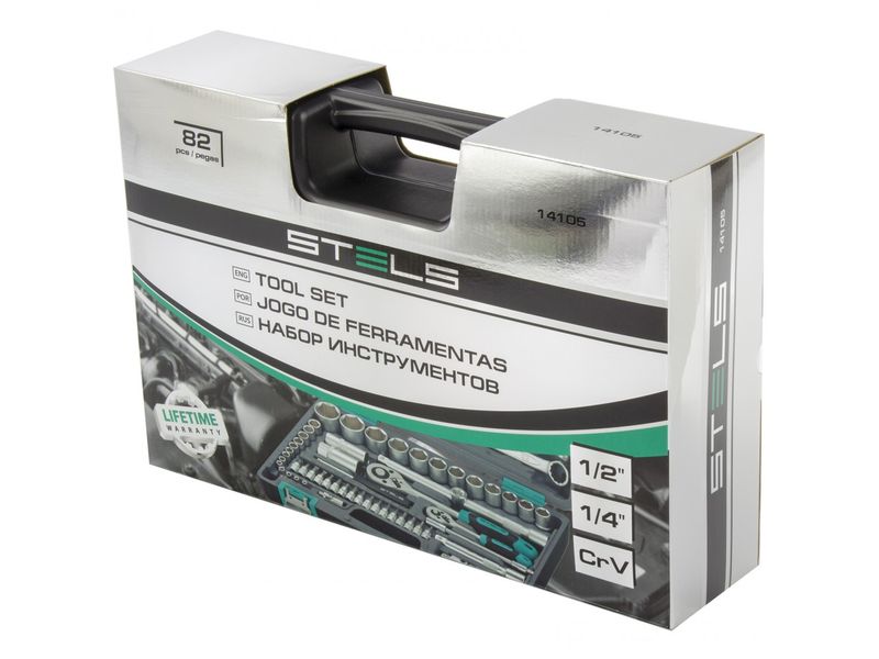 Набор инструментов Stels 14105 в ударопрочным пластиковом кейсе состоит из 82 предметов с присоединительными квадратами 1/2 и 1/4, из стали CrV и S2, и предназначен для выполнения слесарно-монтажных работ. Включает инструменты и насадки для работы с резьбовыми крепежами, а также удлинители (в том числе гибкий) и т-образные воротки, облегчающие работу в труднодоступных местах. Набор предназначен для профессионального использования в автомастерской, будет полезен и для решения бытовых задач.