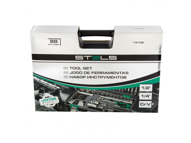 Набор инструментов Stels 14109 в ударопрочным пластиковом кейсе состоит из 88 предметов с присоединительными квадратами 1/2 и 1/4, из стали CrV и S2, и предназначен для выполнения слесарно-монтажных работ. Включает инструменты и насадки для работы с резьбовыми крепежами, а также удлинители и т-образный вороток, облегчающие работу в труднодоступных местах. Набор предназначен для профессионального использования в автомастерской, будет полезен и для решения бытовых задач.