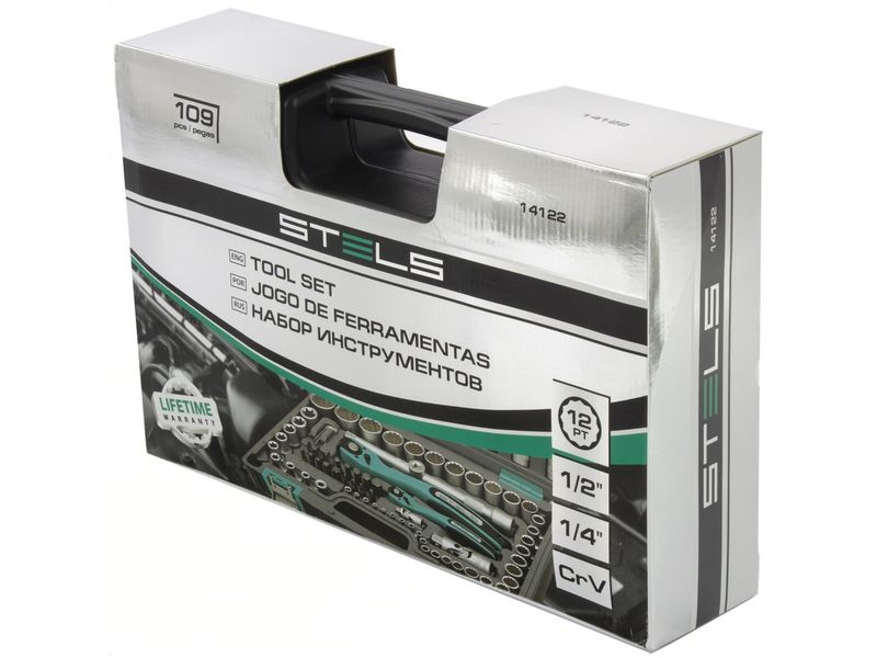 Набор инструментов Stels 14122 в ударопрочным пластиковом кейсе состоит из 109 предметов с присоединительными квадратами 1/2 и 1/4, из стали CrV и S2, и предназначен для выполнения слесарно-монтажных работ. Включает инструменты и насадки для работы с резьбовыми крепежами, в том числе 12-гранные торцевые головки, т-образный вороток и удлинители, облегчающие работу в труднодоступных местах. Набор предназначен для профессионального использования в автомастерской, будет полезен и для решения бытовых задач.
