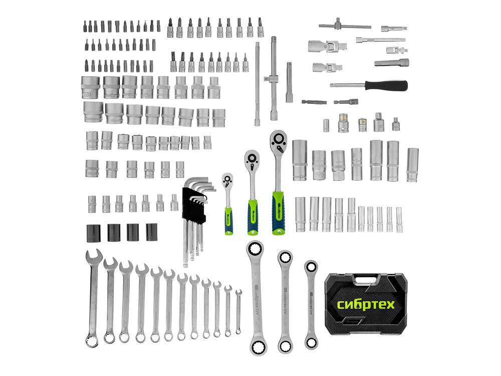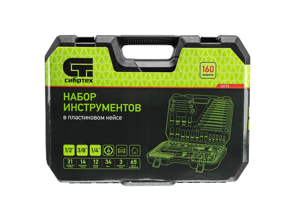 Набор инструментов Сибртех 14172 упакован в пластиковый кейс и состоит из 160 предметов с присоединительным размером 1/2, 3/8, 1/4, предназначенных для монтажа и демонтажа резьбового крепежа с разными типами шлицев. В комплект поставки входят карданы, удлинители и переходники, облегчающие работу в труднодоступных местах. Набор используется для ремонта автомобилей, а также будет полезен в быту.
