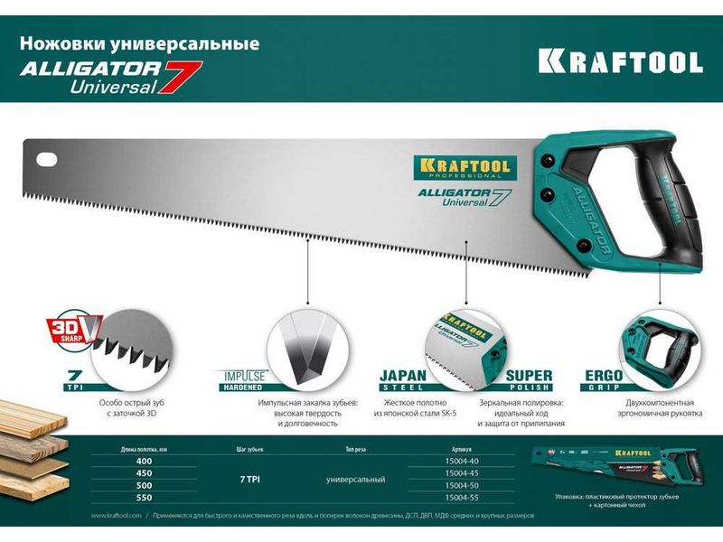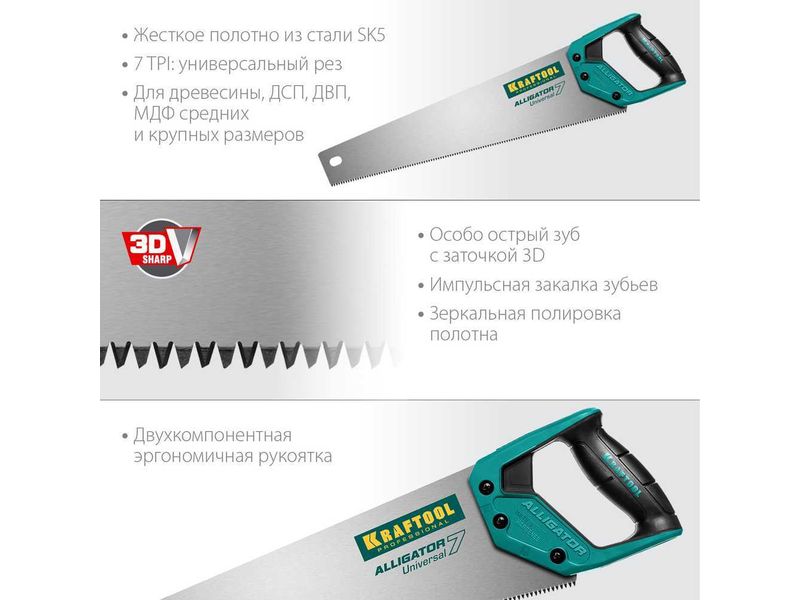 Купить Ножовка универсальная "Alligator 7", 450 мм, 7 TPI 3D зуб, KRAFTOOL