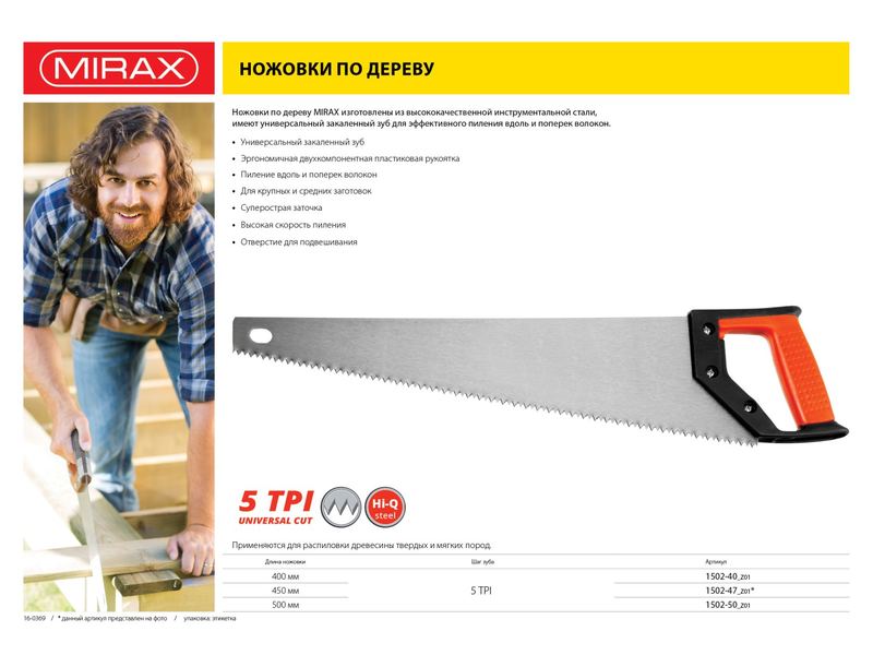 Ножовка по дереву MIRAX изготовлена из высококачественной инструментальной стали с универсальным закаленным зубом.