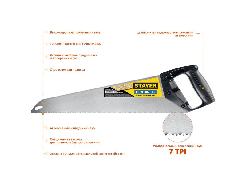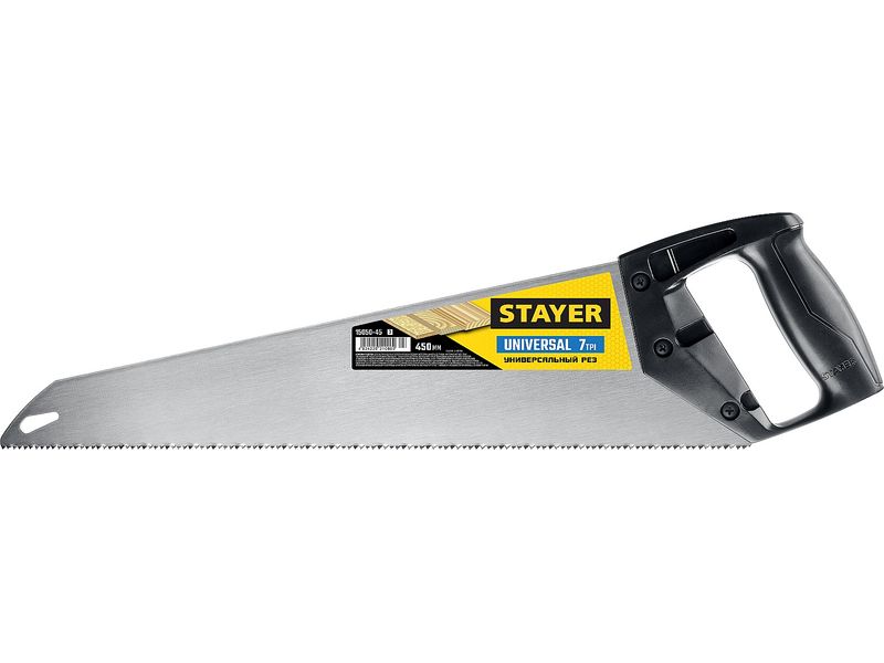 Ножовка универсальная (пила) "Universal", 450мм,7TPI, закаленный зуб, рез вдоль и поперек волокон, для средних заготовок, фанеры, ДСП, МДФ, STAYER