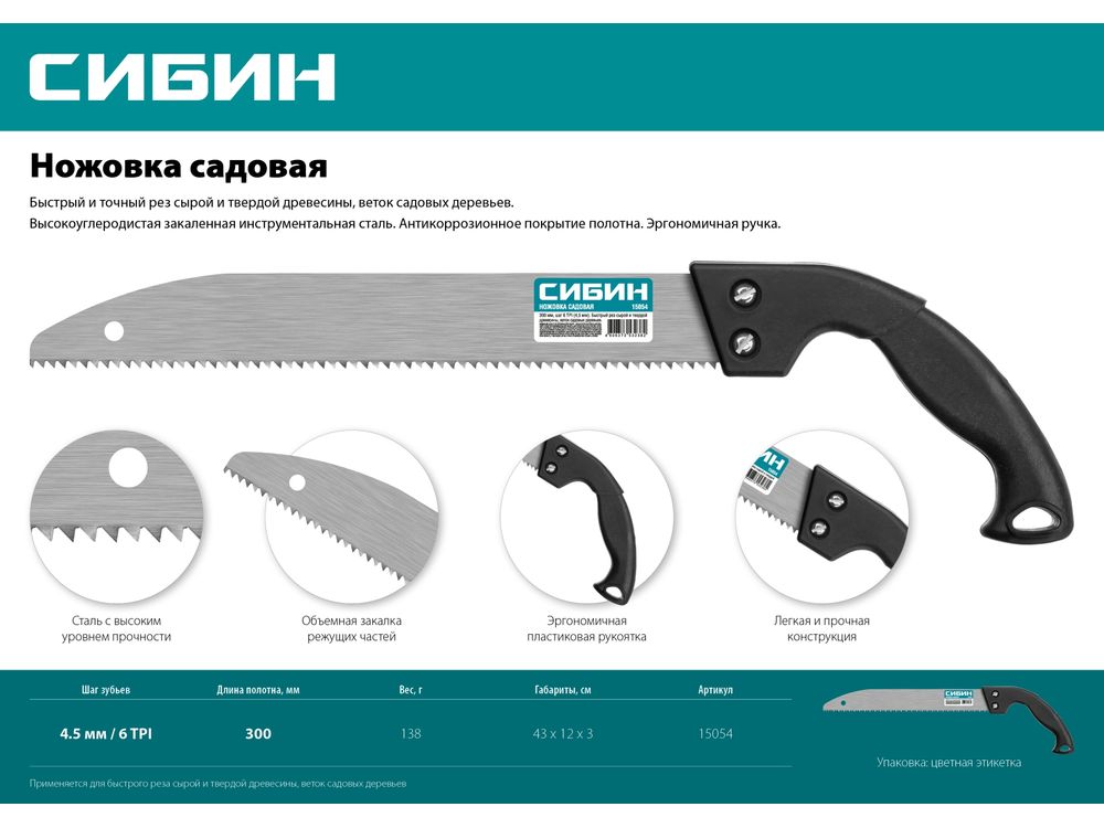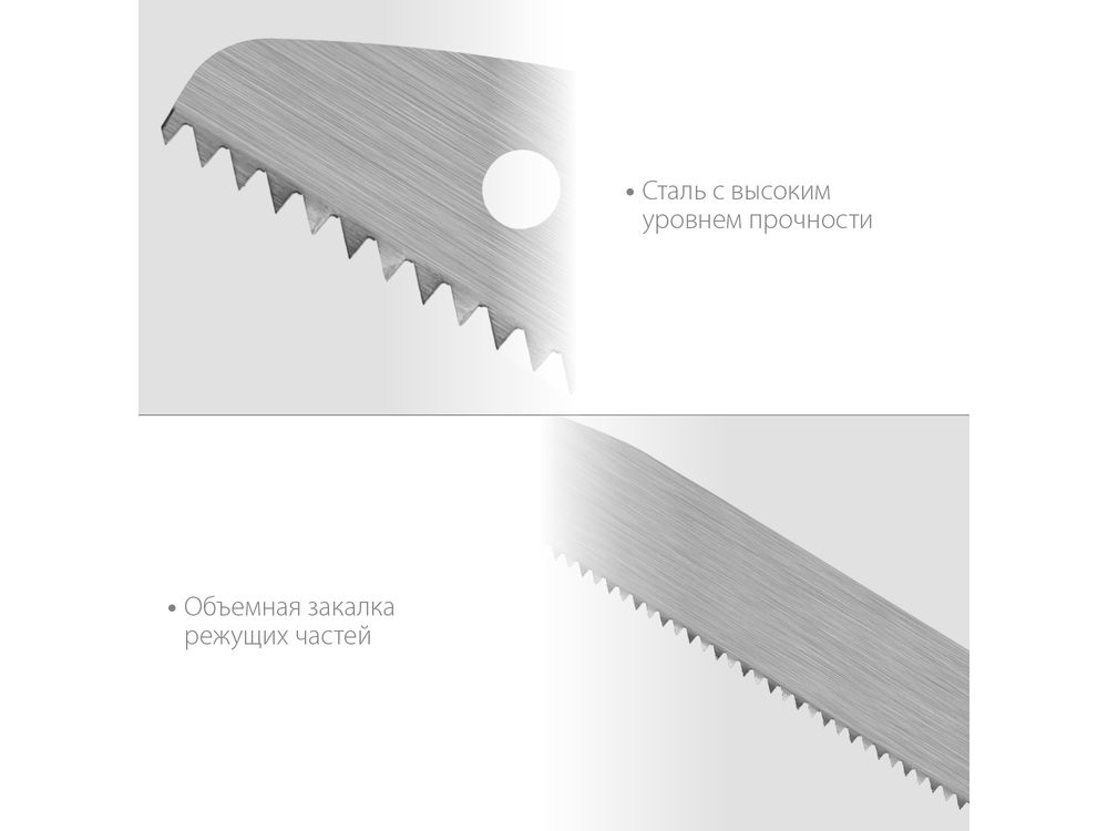 Быстрый и точный рез сырой и твердой древесины, веток садовых деревьев. Высокоуглеродистая закаленная инструментальная сталь. Антикоррозионное покрытие полотна. Эргономичная ручка.