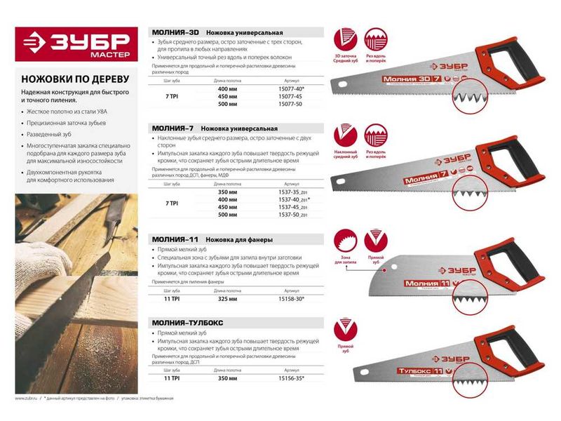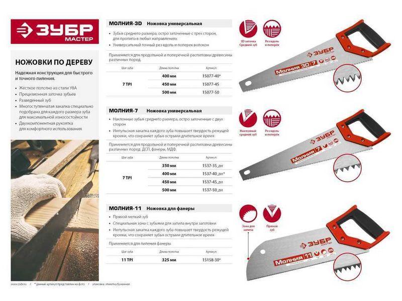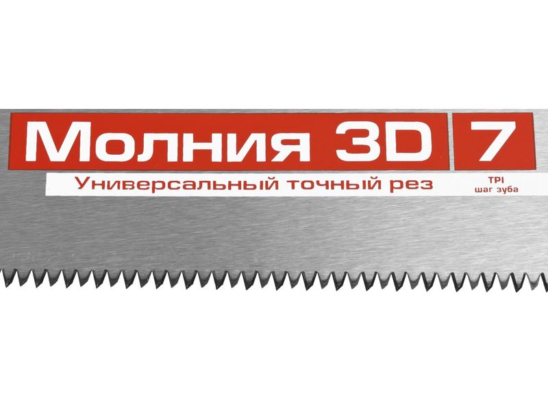 Профессиональная ножовка по дереву «МОЛНИЯ-3D» с крупными прямыми зубьями, остро заточенными с трех сторон, обеспечивает точный рез вдоль и поперек волокон, для средних заготовок из всех видов материалов