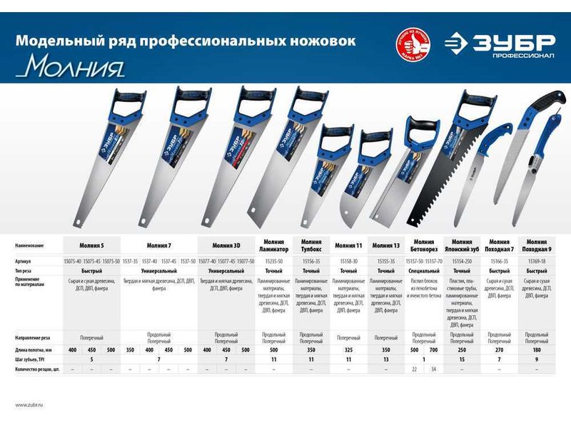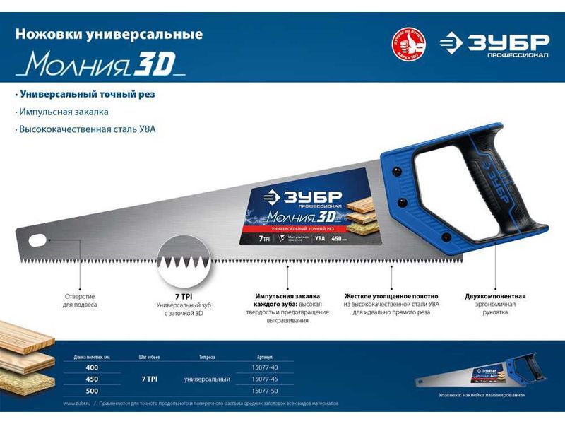 Профессиональная ножовка по дереву «МОЛНИЯ-3D» с крупными прямыми зубьями, остро заточенными с трех сторон, обеспечивает точный рез вдоль и поперек волокон, для средних заготовок из всех видов материалов