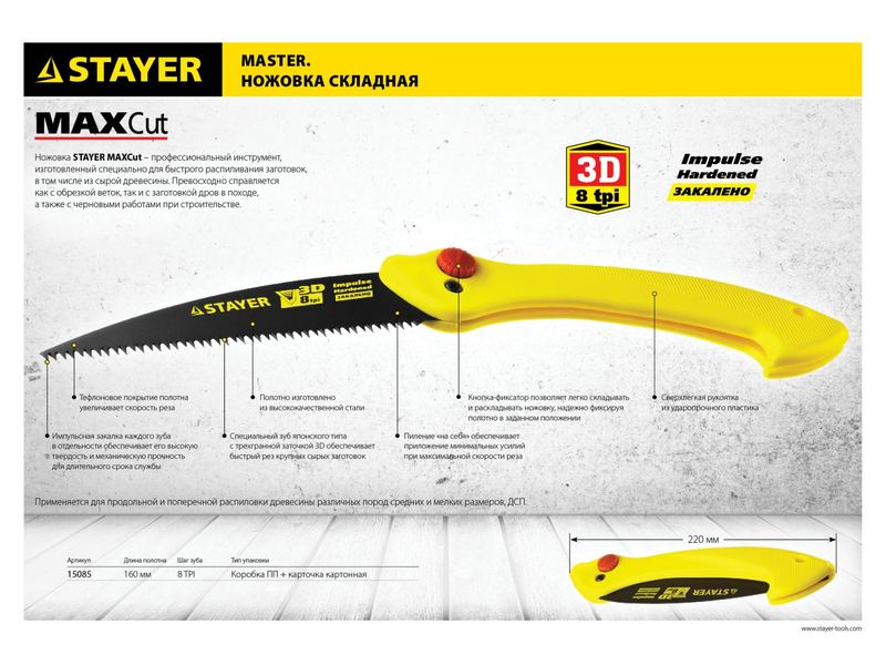 Ножовка STAYER MASTER МАХ-Сut ручная складная, с тефлоновым покрытием, 3-D зуб - 8 TPI (3,5 мм), 160 мм
