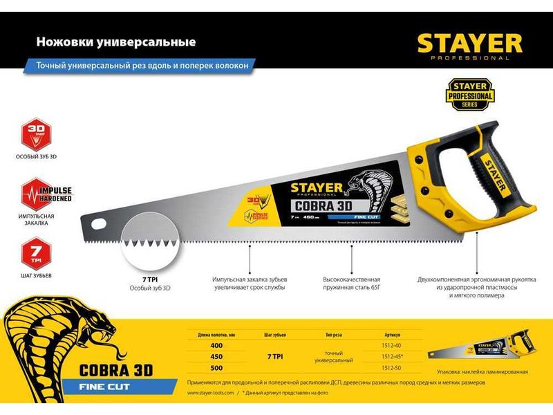 Купить Ножовка универсальная (пила) "Cobra 3D" 450мм, 7TPI, 3D зуб, точн.рез вдоль и поперек волокон, для средних заготовок из всех видов материалов, STAYER