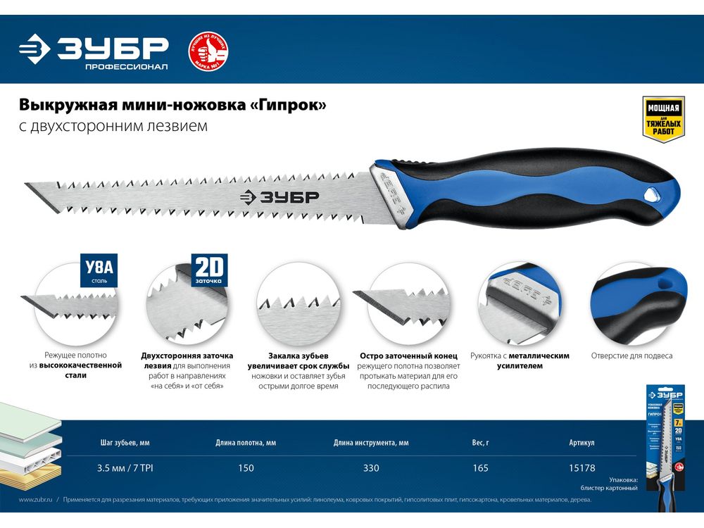 Купить ЗУБР Гипрок 150 мм выкружная мини-ножовка для гипсокартона с двухсторонним лезвием