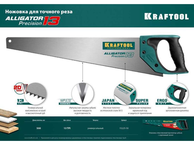 Преимущества Специальный высокоточный зуб, Японская сталь SK5, Высокоточная заточка, Импульсная закалка зуба обеспечивает высокую твёрдость и долговечность, Жёсткое полотно обеспечивает максимальное удобство пиления, Двухкомпонентная эргономичная рукоятка из ударопрочного пластика, Японская сталь SK-5 Высокоточная заточка Импульсная закалка зуба обеспечивает высокую твёрдость и долговечность Жёсткое полотно обеспечивает максимальное удобство пиления Двухкомпонентная эргономичная рукоятка из ударопрочного пластика Использование Для продольной и поперечной распиловки ламината