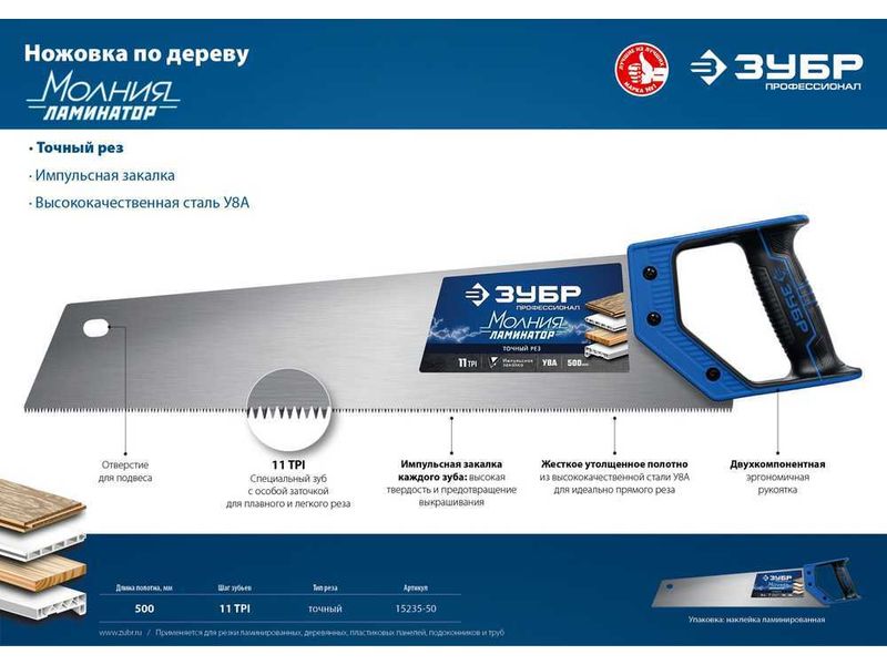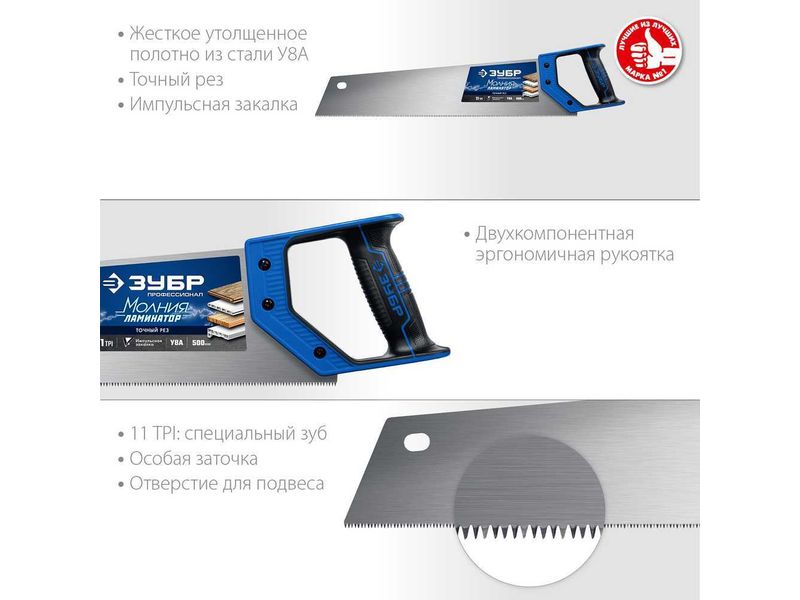 Ручной инструментСтолярный инструментНожовка Ножовка по дереву (пила) ЗУБР ЛЕВША-Ламинатор 500 мм, 11TPI, 3D зуб, для ламинир, деревянных, пластиковых панелей, подоконников и труб-53
