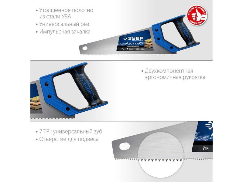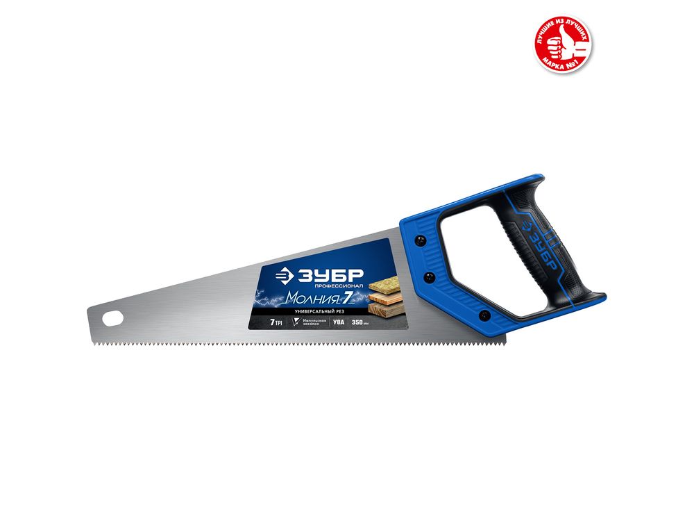 Ножовка универсальная (пила) "МОЛНИЯ-7" 350 мм, 7 TPI, закалка, рез вдоль и поперек волокон, для средних заготовок, фанеры, ДСП, МДФ, ЗУБР