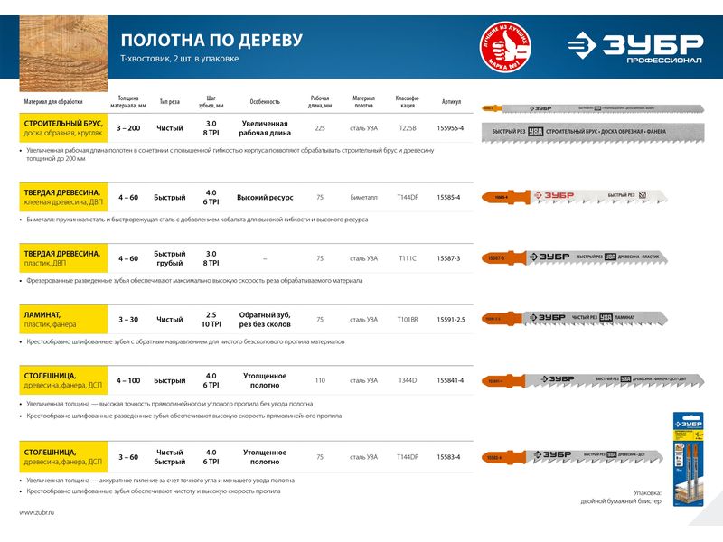 Полотна ЗУБР ЭКСПЕРТ для электролобзиков имеют увеличенную толщину рабочей части, что даёт повышенную устойчивость к излому и перегибу. Применяются на электрических лобзиках при резке массива древесины, многослойной фанеры и ДСП. Преимущества