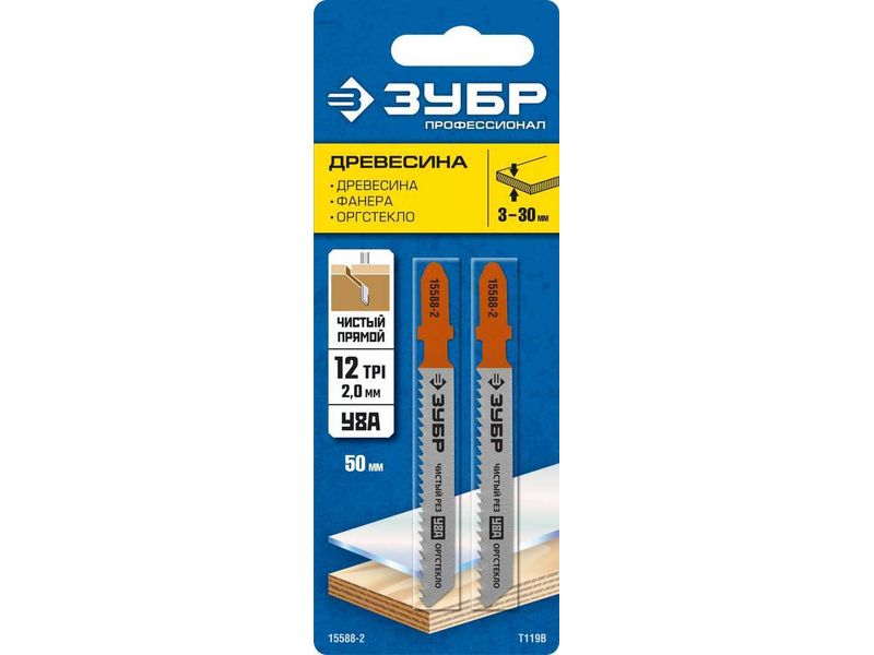 Полотна ЗУБР "ПРОФЕССИОНАЛ", T119B, для эл/лобзика, Cr-V, по дереву, T-хвост., шаг 2мм, 50мм, 2шт-418