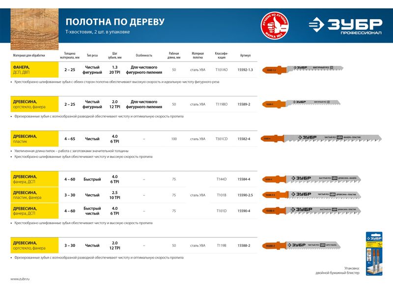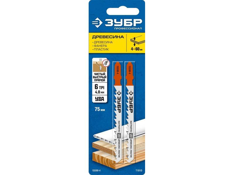 Купить Полотна ЗУБР ПРОФЕССИОНАЛ, T101D, для эл/лобзика, Cr-V, по дереву, T-хвост., шаг 4мм, 75мм, 2шт