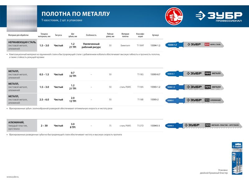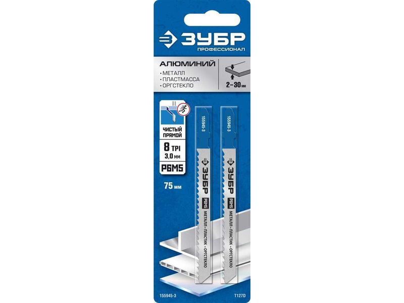 Купить Полотна ЗУБР "Профессионал", T127D, для эл/лобзика, HSS, по алюминию, мягкому металлу, T-хвостовик, шаг 3мм, 75мм, 2шт