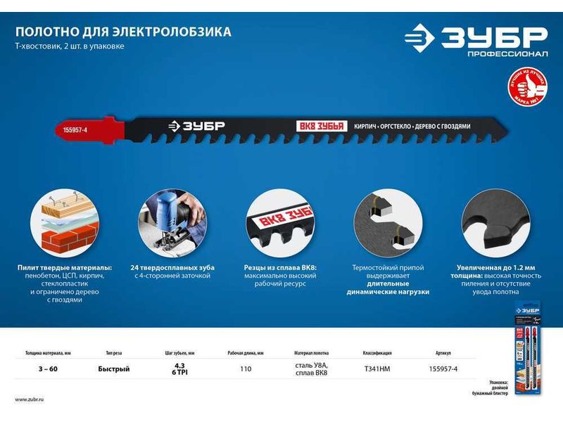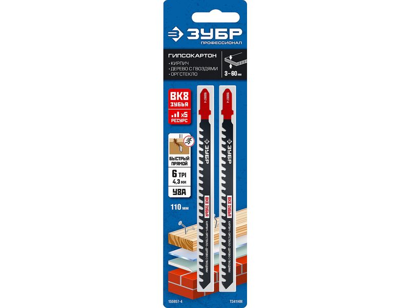 Полотна ЗУБР "ПРОФЕССИОНАЛ" T341HM, с тв. зубьями по пенобетону, кирпичу, Т-хвост., шаг 4,3мм, 130/110мм, 2шт