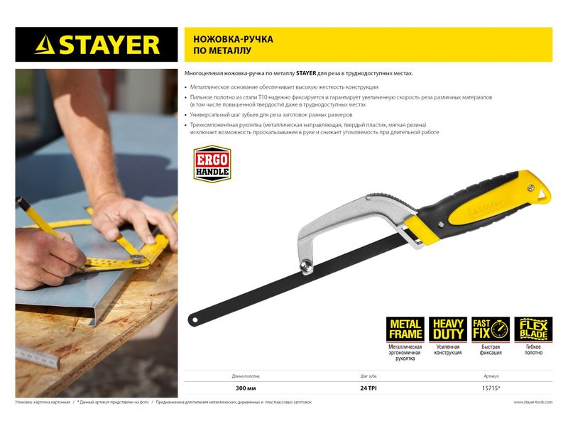 Ножовка ручка по металлу STAYER, двухкомпонентная рукоятка с металлической державкой, 300 мм.