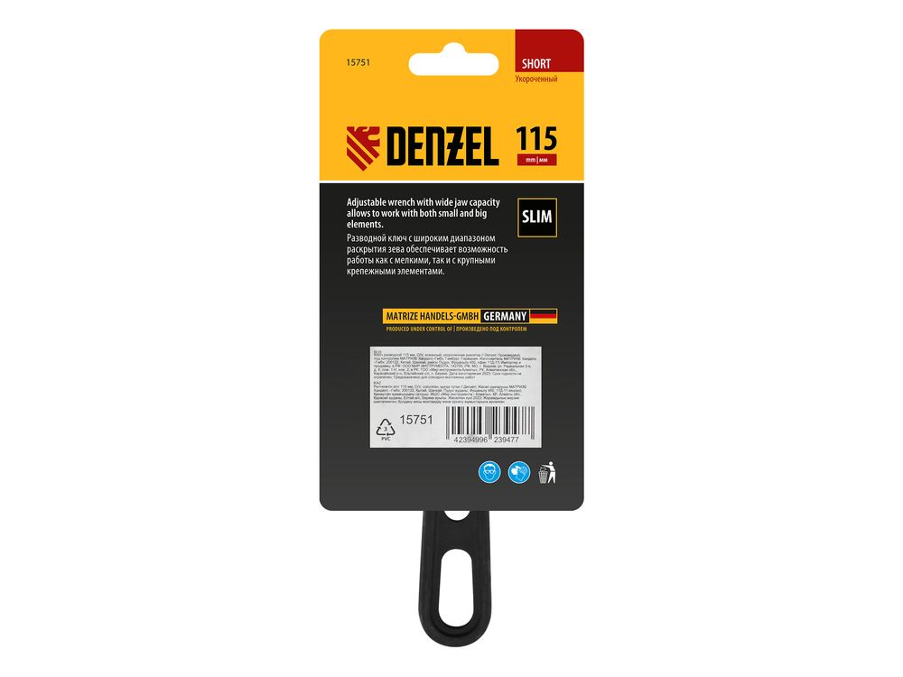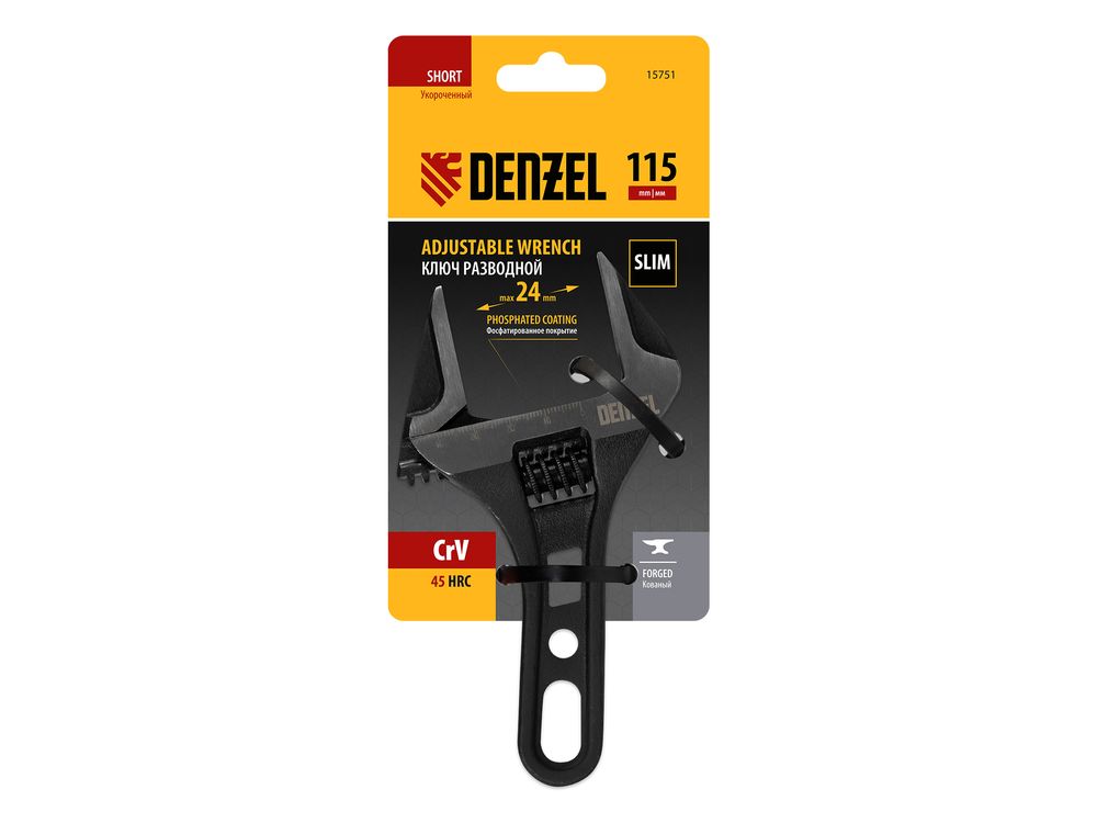 Ключ разводной кованый Denzel 15751 длиной 115 мм, из стали CrV, с укороченной рукояткой и увеличенным раскрытием губок, используется для монтажа и демонтажа крепежных элементов диаметром до 24 мм. Благодаря тонким губкам и укороченной рукоятке удобен для работы в труднодоступных местах. Имеет широкую область применения: сантехнические работы, мелкий бытовой ремонт, полупрофессиональная сфера и т. д.