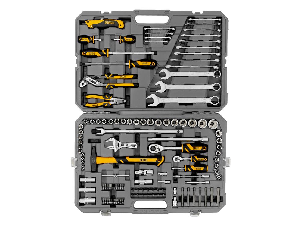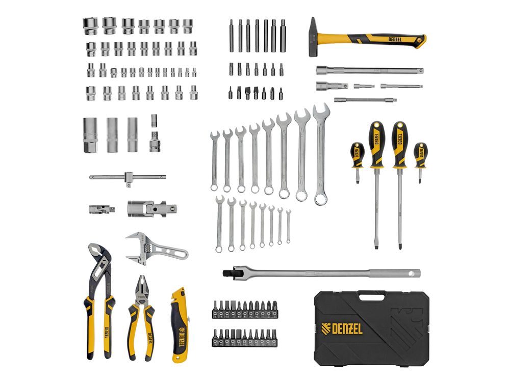 Набор инструментов Denzel 15804 состоит из 122 предметов с присоединительными квадратами 1/4 и 1/2, упакованных во вместительный ударопрочный кейс собственной разработки с антивандальным покрытием. В комплект поставки входят инструменты и оснастка для монтажа и демонтажа резьбовых соединений, а также молоток, плоскогубцы, переставные клещи для выполнения слесарных и сантехнических работ и нож для резки материалов. Набор предназначен для профессионального использования в автомастерской, будет полезен и для решения бытовых вопросов.