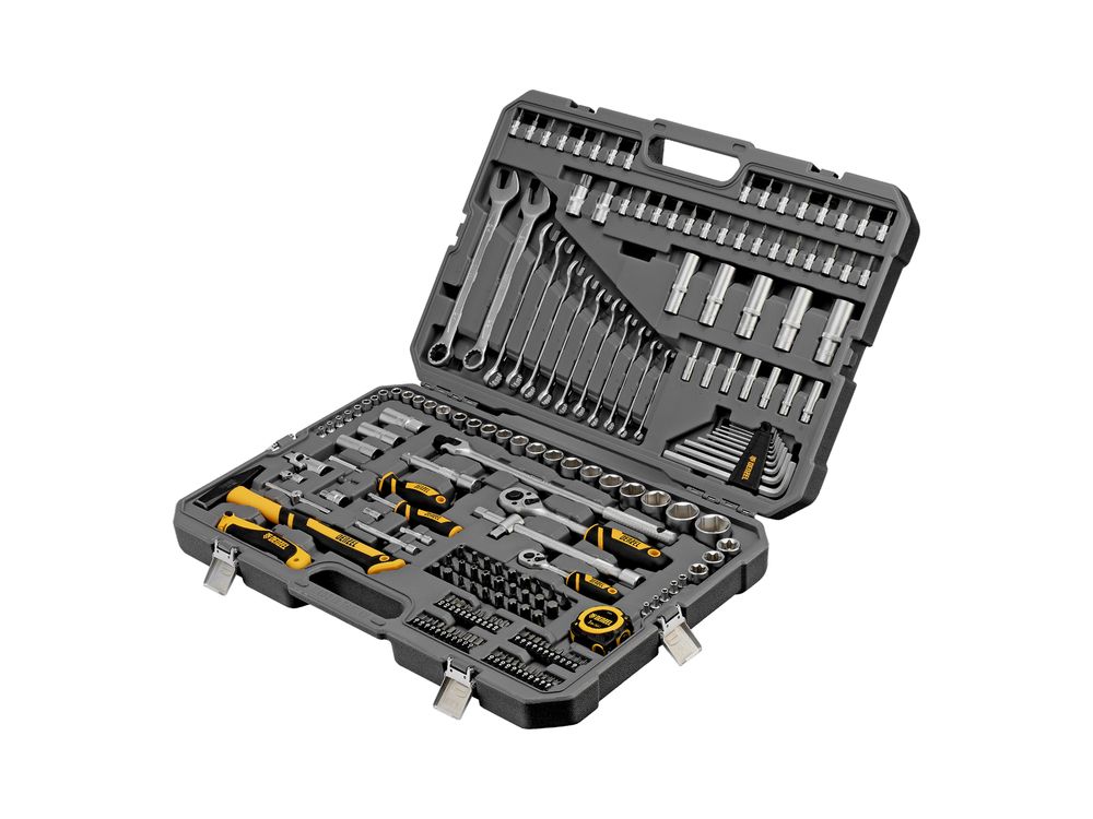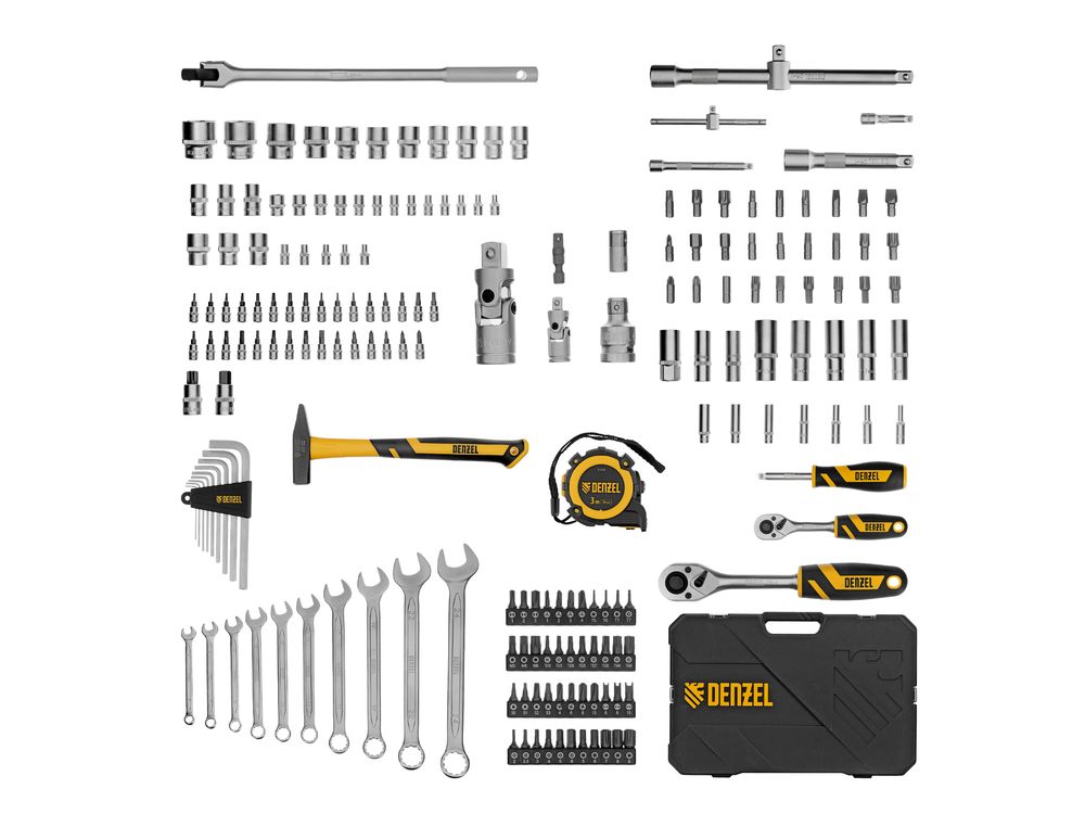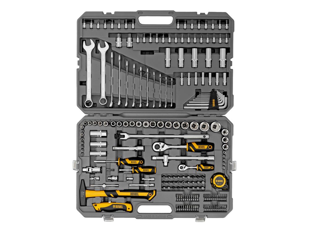 Набор инструментов Denzel 15806 состоит из 194 предметов с присоединительными квадратами 1/4 и 1/2, упакованных во вместительный ударопрочный кейс собственной разработки с антивандальным покрытием. В комплект поставки входят инструменты и оснастка для монтажа и демонтажа резьбовых соединений, а также молоток для выполнения ударных работ, рулетка для проведения измерений и нож для резки материалов. Набор предназначен для профессионального использования в автомастерской, будет полезен и для решения бытовых вопросов.